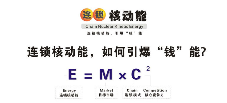 ,這是世界著名的愛(ài)因斯坦能量公式。基于愛(ài)因斯坦的相對(duì)論和能量公式,產(chǎn)生了原子彈和核電站,今天的人類太空實(shí)踐證實(shí)了愛(ài)因斯坦理論的正確性,人類因此發(fā)生了翻天覆地的變化。在愛(ài)因斯坦的能量公式中,M是質(zhì)量,C是光速,當(dāng)速度為光速時(shí),即使很小的質(zhì)量也能轉(zhuǎn)化為非常大的能量。 廣州采納企業(yè)管理顧問(wèn)有限公司首席咨詢師陳宏創(chuàng)建的的連鎖核動(dòng)能理論(全名:連鎖內(nèi)核能量裂變激增理論)是以愛(ài)因斯坦的能量公式為基礎(chǔ)創(chuàng)建,但其含義和指向是不同的:M=目標(biāo)市場(chǎng)(Market),C1=連鎖模式(Chain),C2 =核心競(jìng)爭(zhēng)力(Competition),其理論意義是,企業(yè)找準(zhǔn)了目標(biāo)市場(chǎng),以連鎖的方式經(jīng)營(yíng),核心競(jìng)爭(zhēng)力越大,推動(dòng)其發(fā)展能量就越大。 連鎖核動(dòng)能理論如何幫助連鎖企業(yè)“引爆錢能”快速發(fā)展?我們用深入淺出的圖形表達(dá)方式對(duì)該理論進(jìn)行分層闡述: